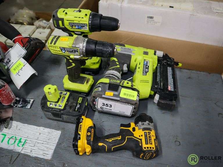 LOT 353 - Ryobi Drills and Nail Gun with Batteries and DeWalt Impact