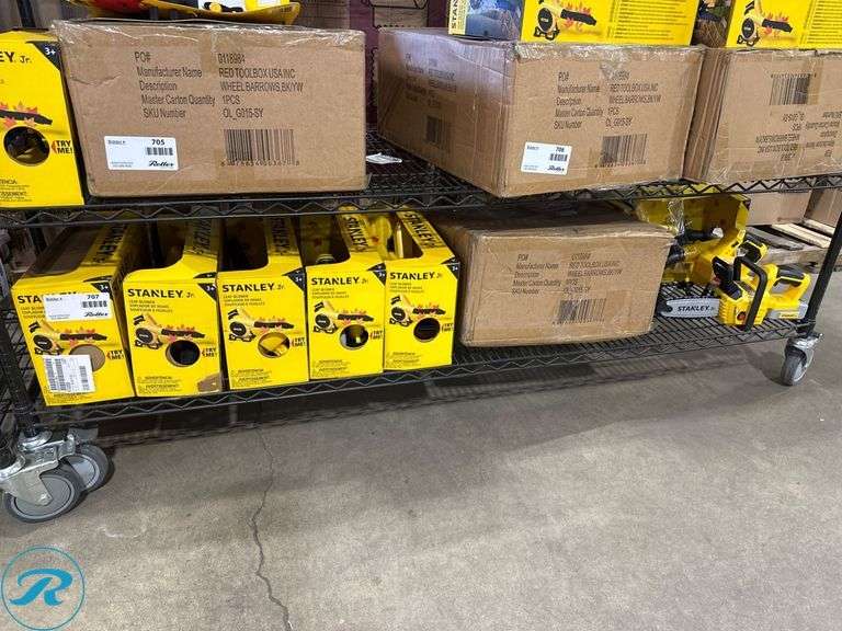 Shelf of Stanley Jr. Toy Tools and Equipment, Including Leaf Blowers, Chainsaws, and Wheelbarrows