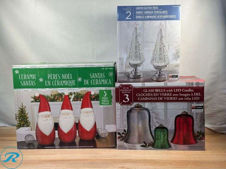 Ceramic Santa, 3 Piece Set- New; Decorative Glass Bells with LED Candles, Set of 3- New; 14" Lighted Glitter Tree Lantern, Set of 2- New