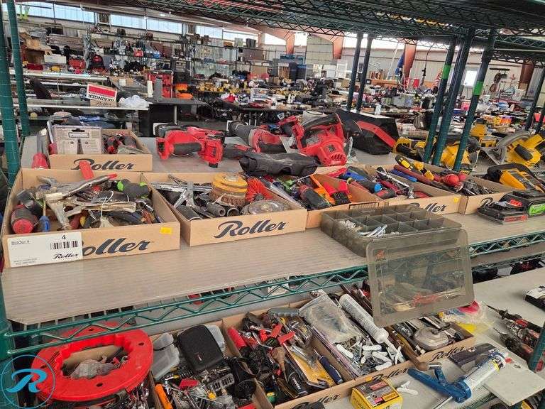 Shelf of Hand Tools and Power Tool Accessories Including Screwdrivers, Pliers, and Batteries