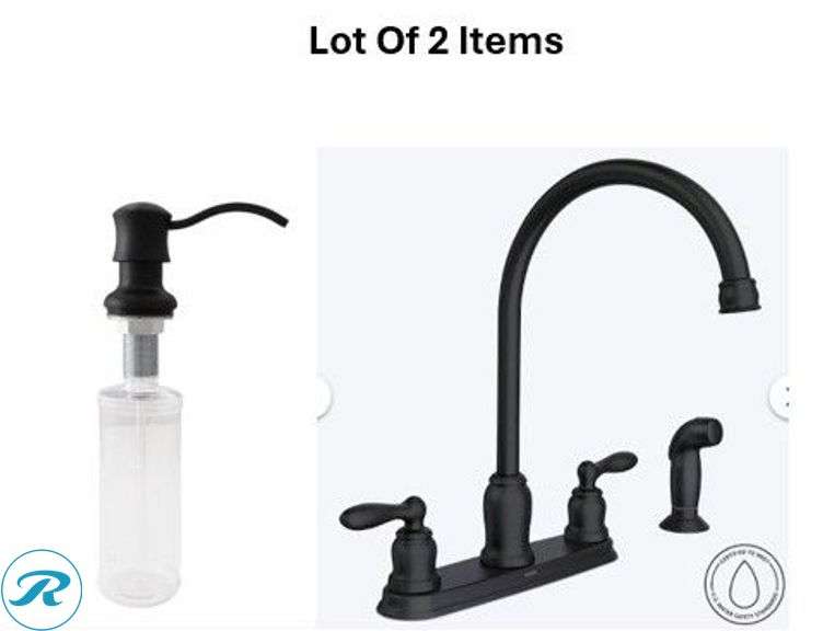 [2 Items Total] New (1) Moen Caldwell Matte Black Double Handle Deck-Mount Kitchen faucet w/ sprayer (includes deck plate side sprayer) (1) Keeney Oil Rubbed Bronze 10 oz Capacity Deck Mount Soap and Lotion Dispenser