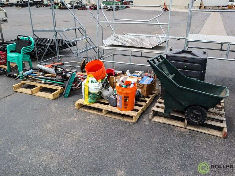 LOT 445 - (3) Pallets of Yard Tools, Wheelbarrow and Composter